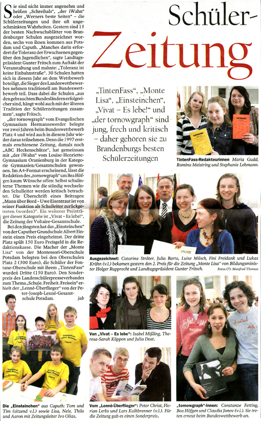 Eine kleine Sammlung von Zeitungsartikeln aus den unterschiedlichsten Blättern soll zeigen, wie die Arbeit von printlayout & webdeisgn ankommt. Aus der Tagespresse gibt es hier eher die Artikel über die bisher stattgefundenen Schülerzeitungswettbewerbe des Landes Brandenburg, an dem die Grundschule Caputh bisher unter meiner Leitung immerhin sechsmal einen Preis erhielt; die Bürgel-Grundschule „nur“ einmal.