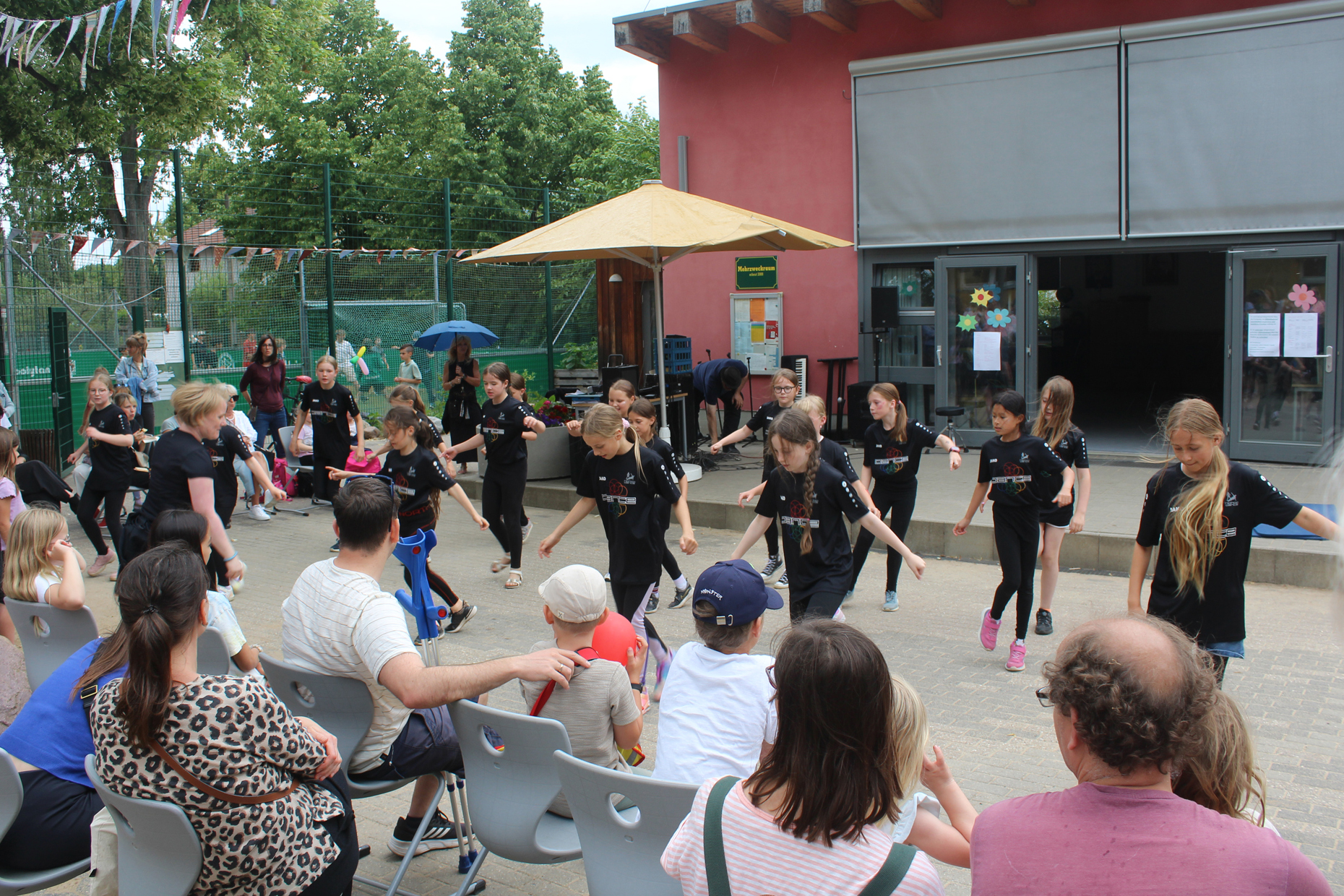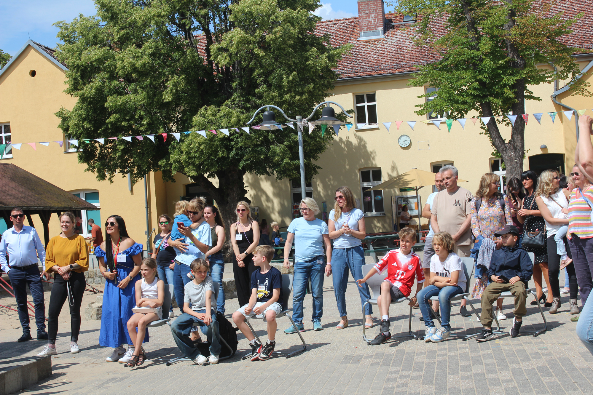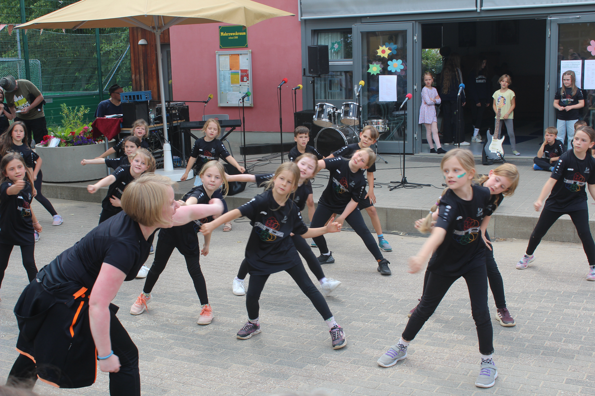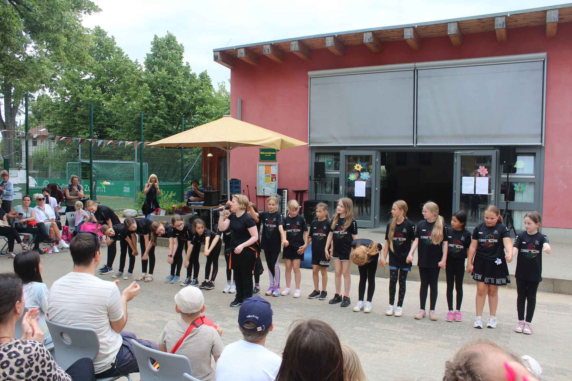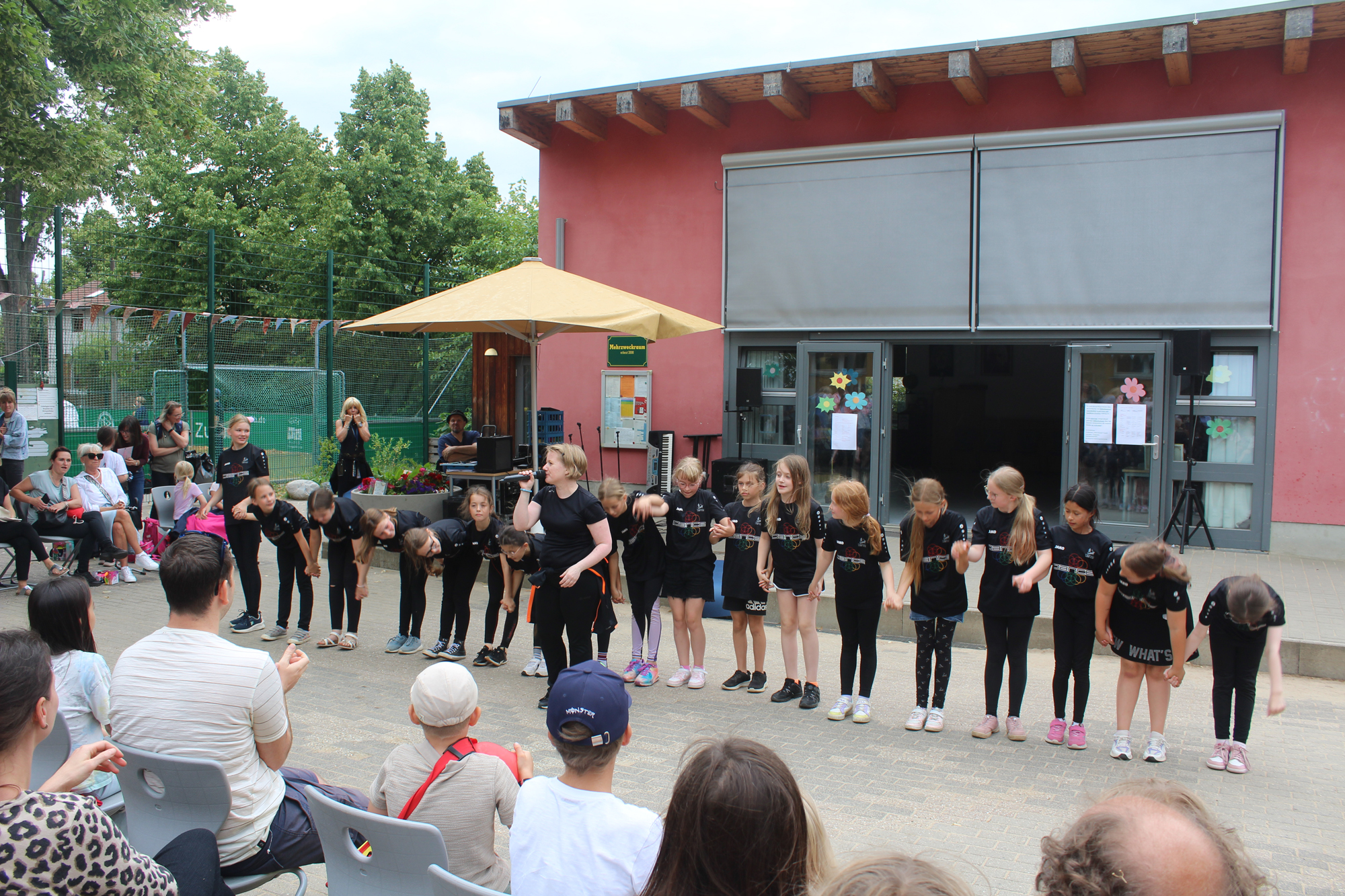 Wenige Tage vor dem Start der Sommerferien gab es wieder ein Fest auf dem Schulhof der EInstein-Grundschule in Caputh. Und wieder war es ein wirklich wunderschöner Nachmittag! Das Wetter spielte toll mit – bis auf ein paar wenige Regentropfen blieb es super sonnig und herrlich warm. So konnten alle Show-Anteile auf der Bühne vor dem Mehrzweckraum stattfinden und viele Eltern, Freunde und Angehöreige nutzten diese Möglichkeit. Was die Kinder im vergangenen Schuljahr in den verschiedensten AGs auf die Beine gestellt und gelernt haben, wurde voller Freude präsentiert.