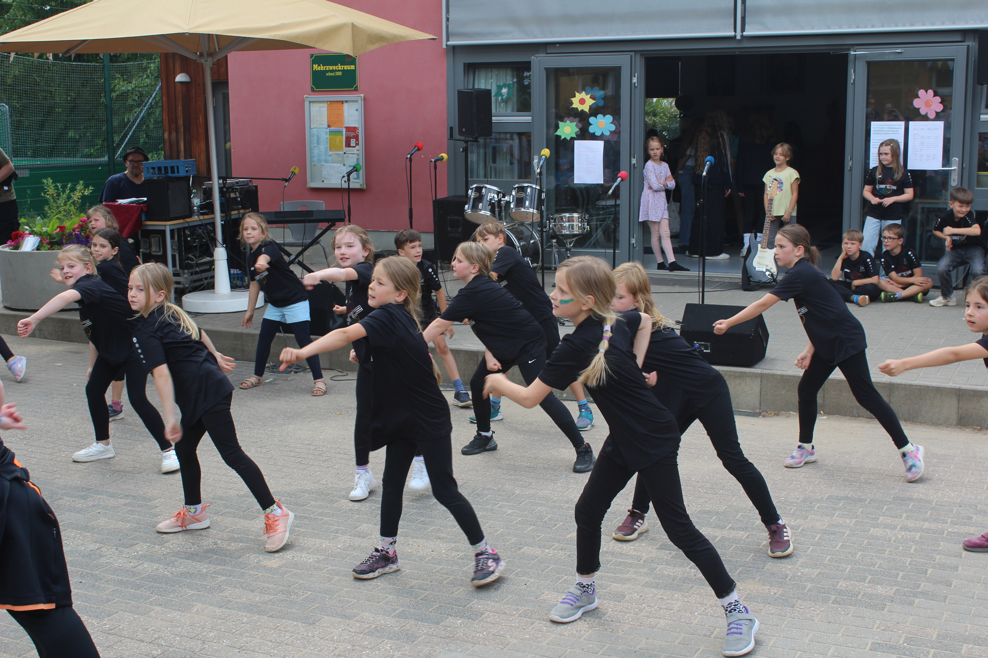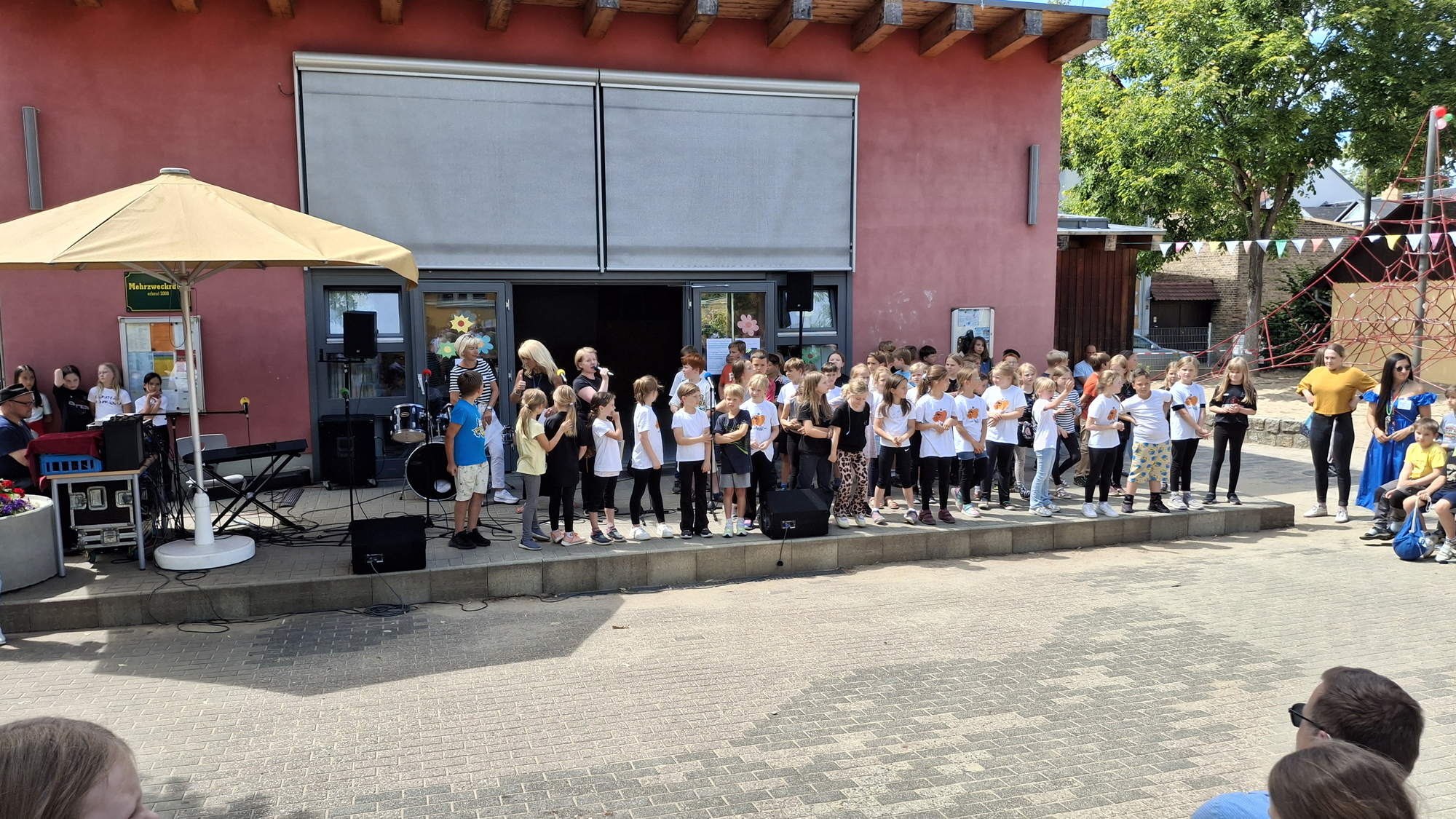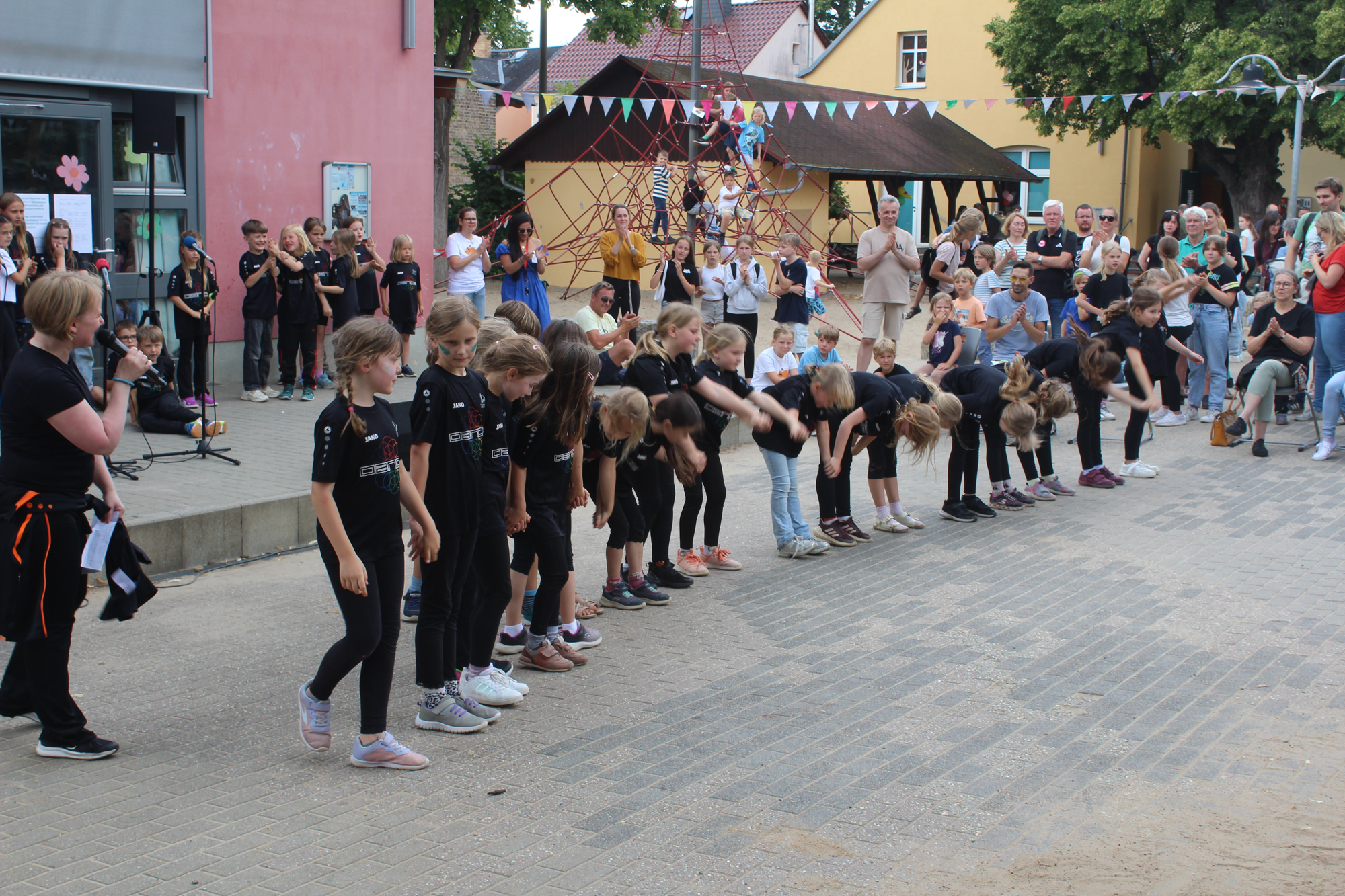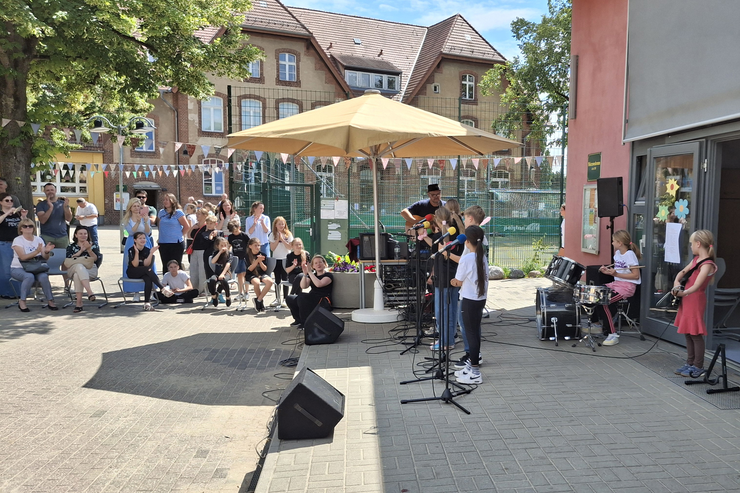 Wenige Tage vor dem Start der Sommerferien gab es wieder ein Fest auf dem Schulhof der EInstein-Grundschule in Caputh. Und wieder war es ein wirklich wunderschöner Nachmittag! Das Wetter spielte toll mit – bis auf ein paar wenige Regentropfen blieb es super sonnig und herrlich warm. So konnten alle Show-Anteile auf der Bühne vor dem Mehrzweckraum stattfinden und viele Eltern, Freunde und Angehöreige nutzten diese Möglichkeit. Was die Kinder im vergangenen Schuljahr in den verschiedensten AGs auf die Beine gestellt und gelernt haben, wurde voller Freude präsentiert.
