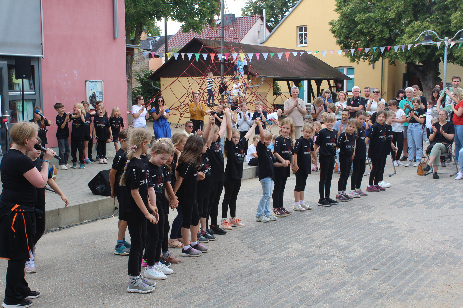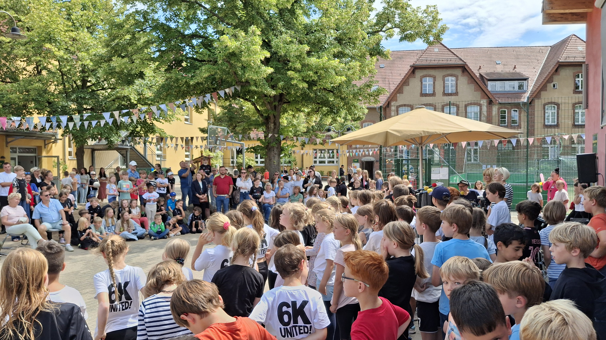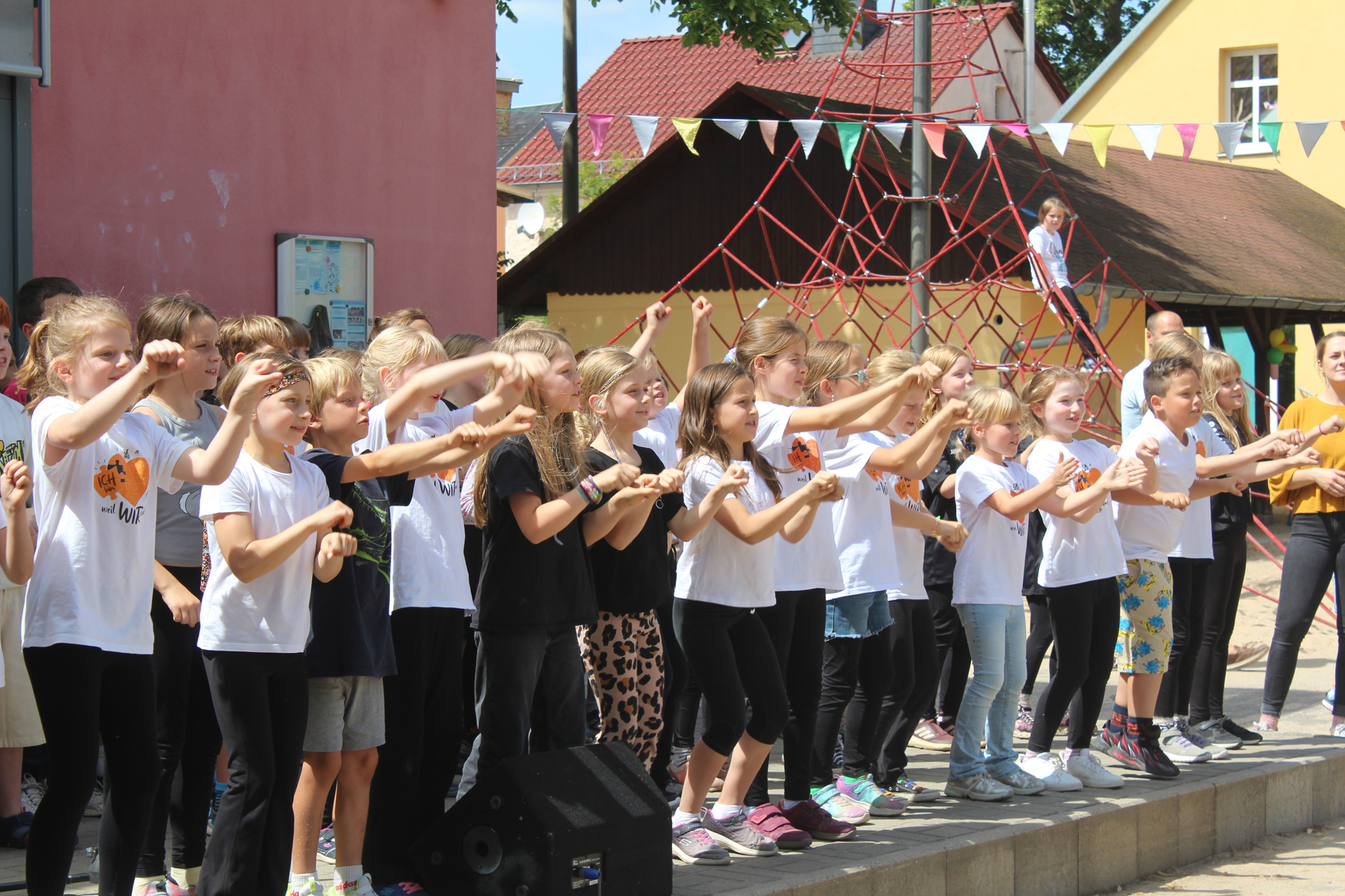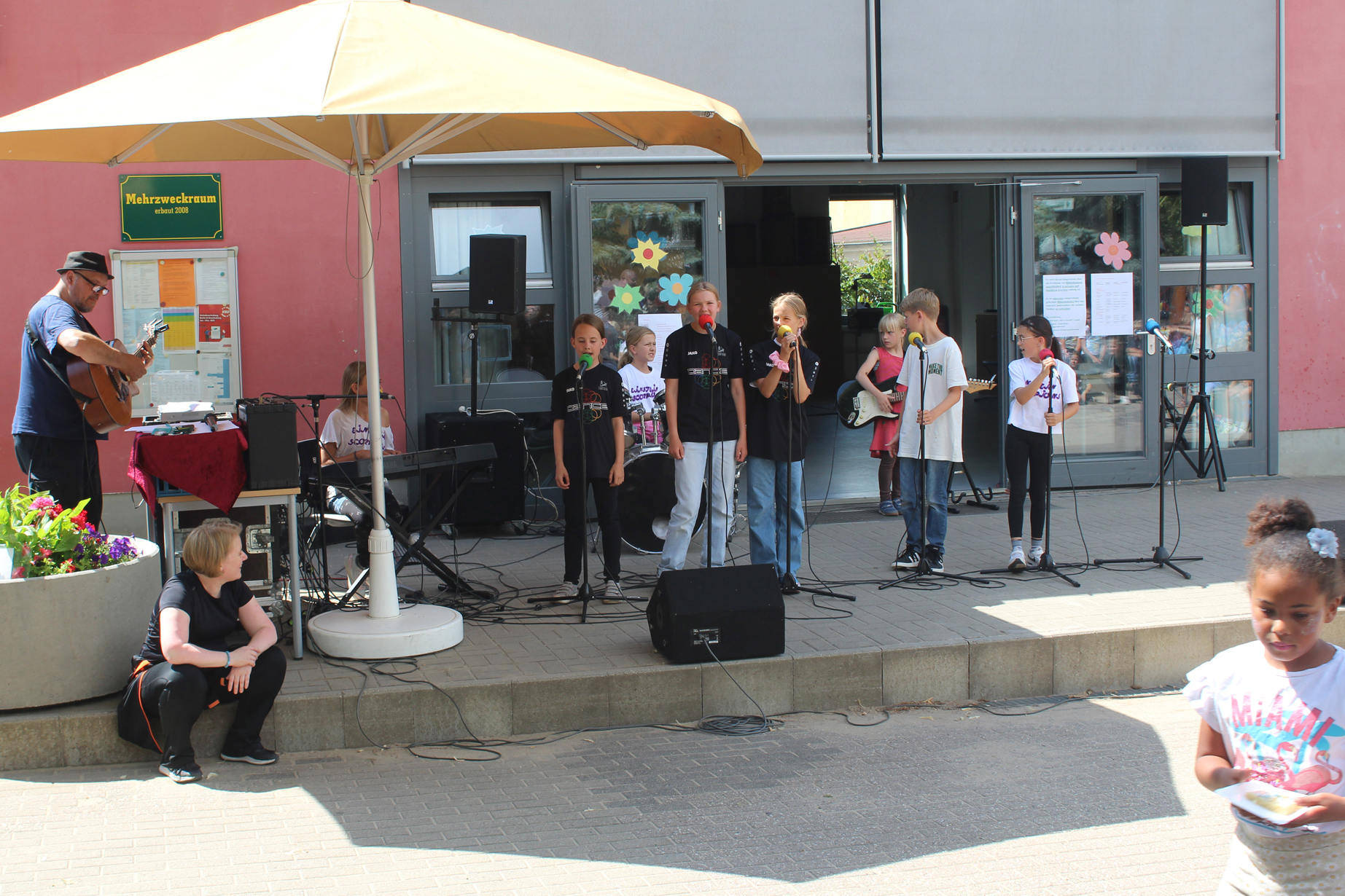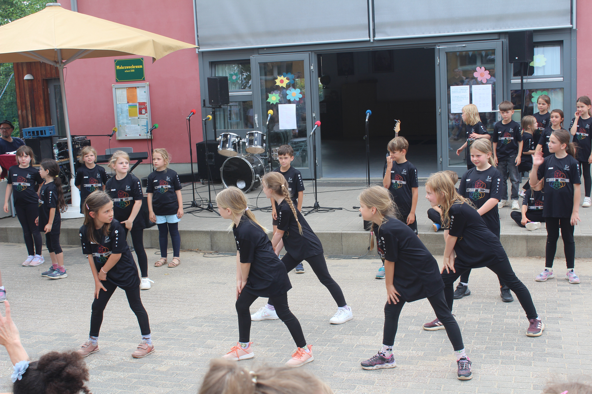Wenige Tage vor dem Start der Sommerferien gab es wieder ein Fest auf dem Schulhof der EInstein-Grundschule in Caputh. Und wieder war es ein wirklich wunderschöner Nachmittag! Das Wetter spielte toll mit – bis auf ein paar wenige Regentropfen blieb es super sonnig und herrlich warm. So konnten alle Show-Anteile auf der Bühne vor dem Mehrzweckraum stattfinden und viele Eltern, Freunde und Angehöreige nutzten diese Möglichkeit. Was die Kinder im vergangenen Schuljahr in den verschiedensten AGs auf die Beine gestellt und gelernt haben, wurde voller Freude präsentiert.