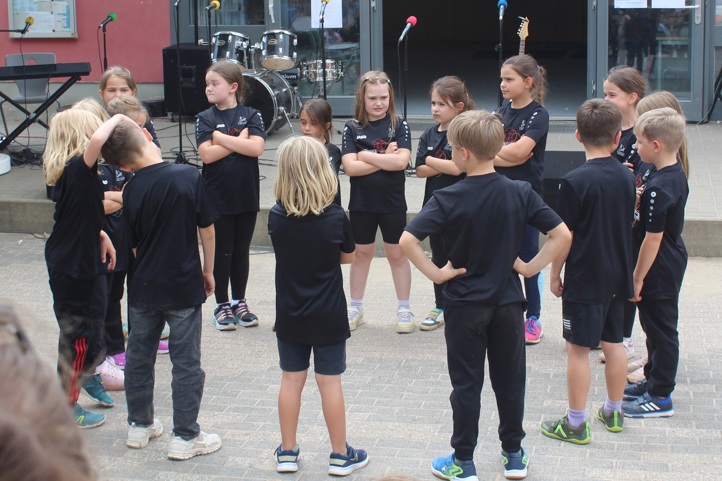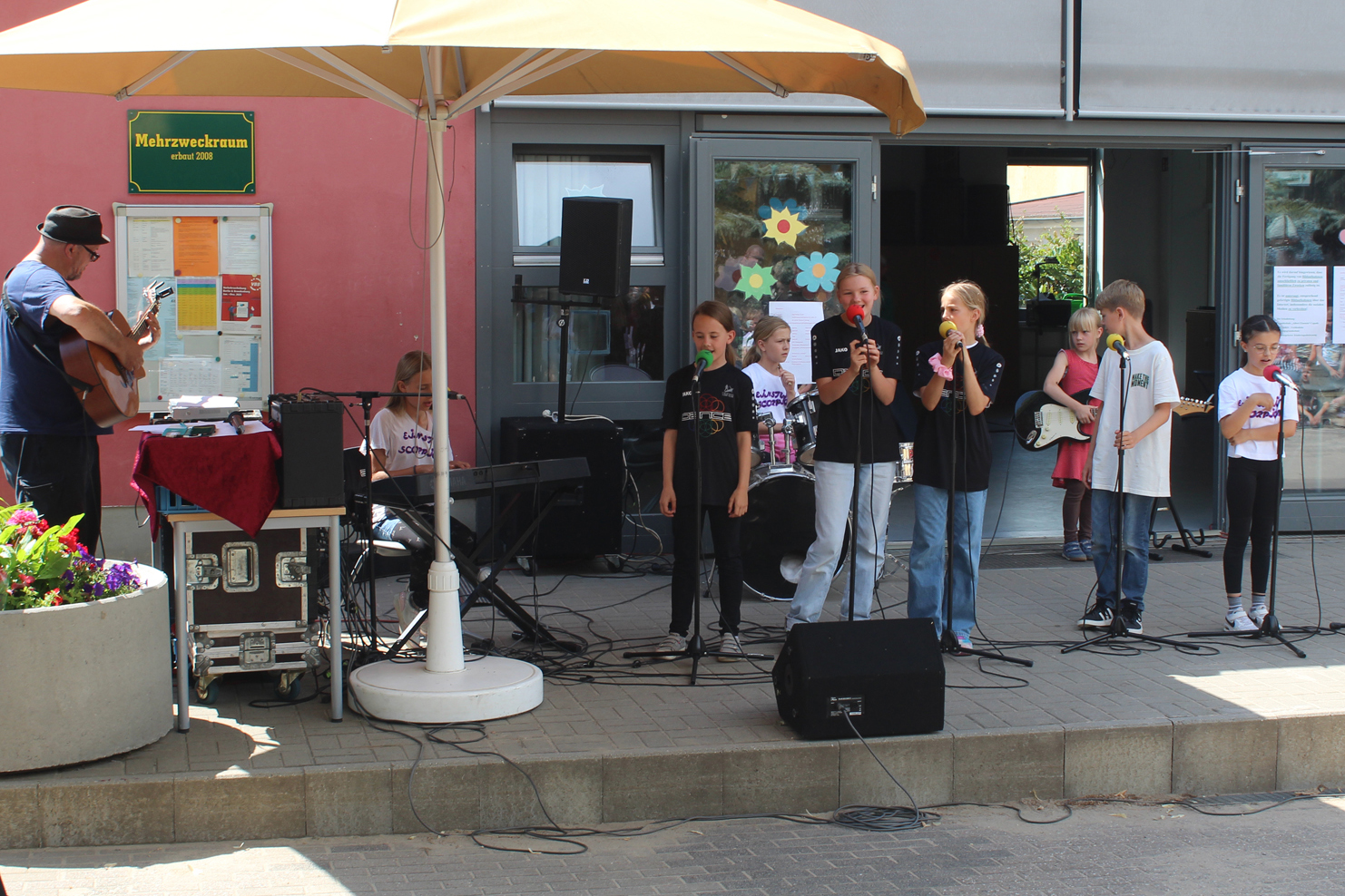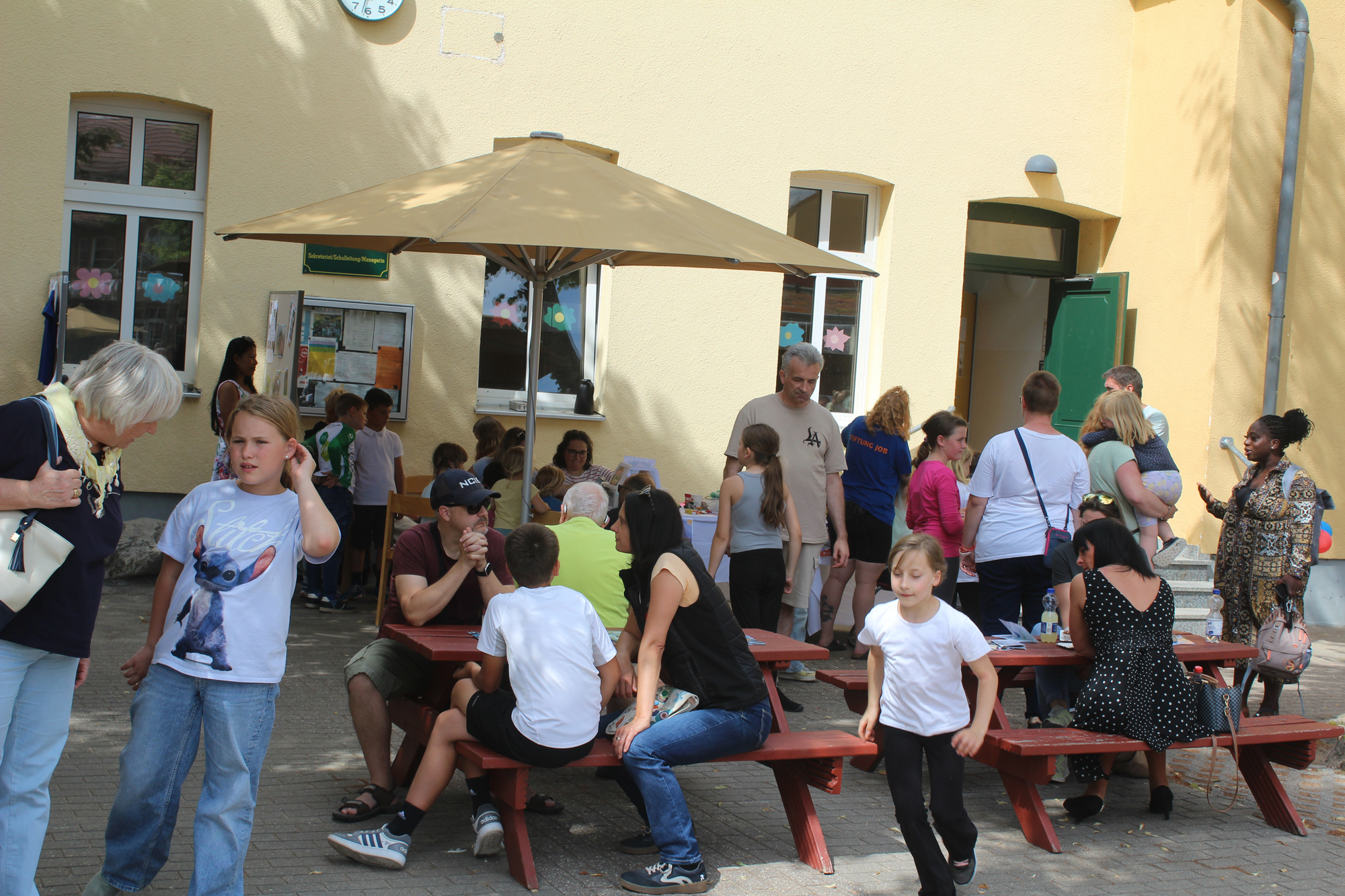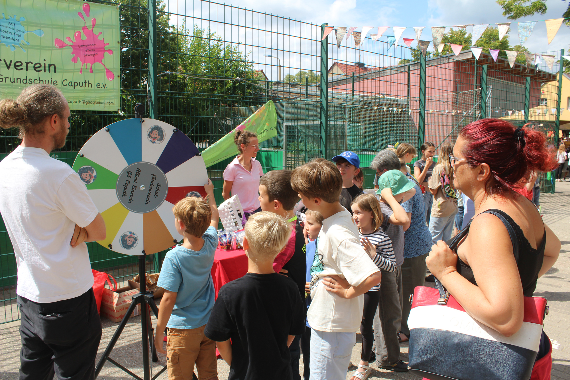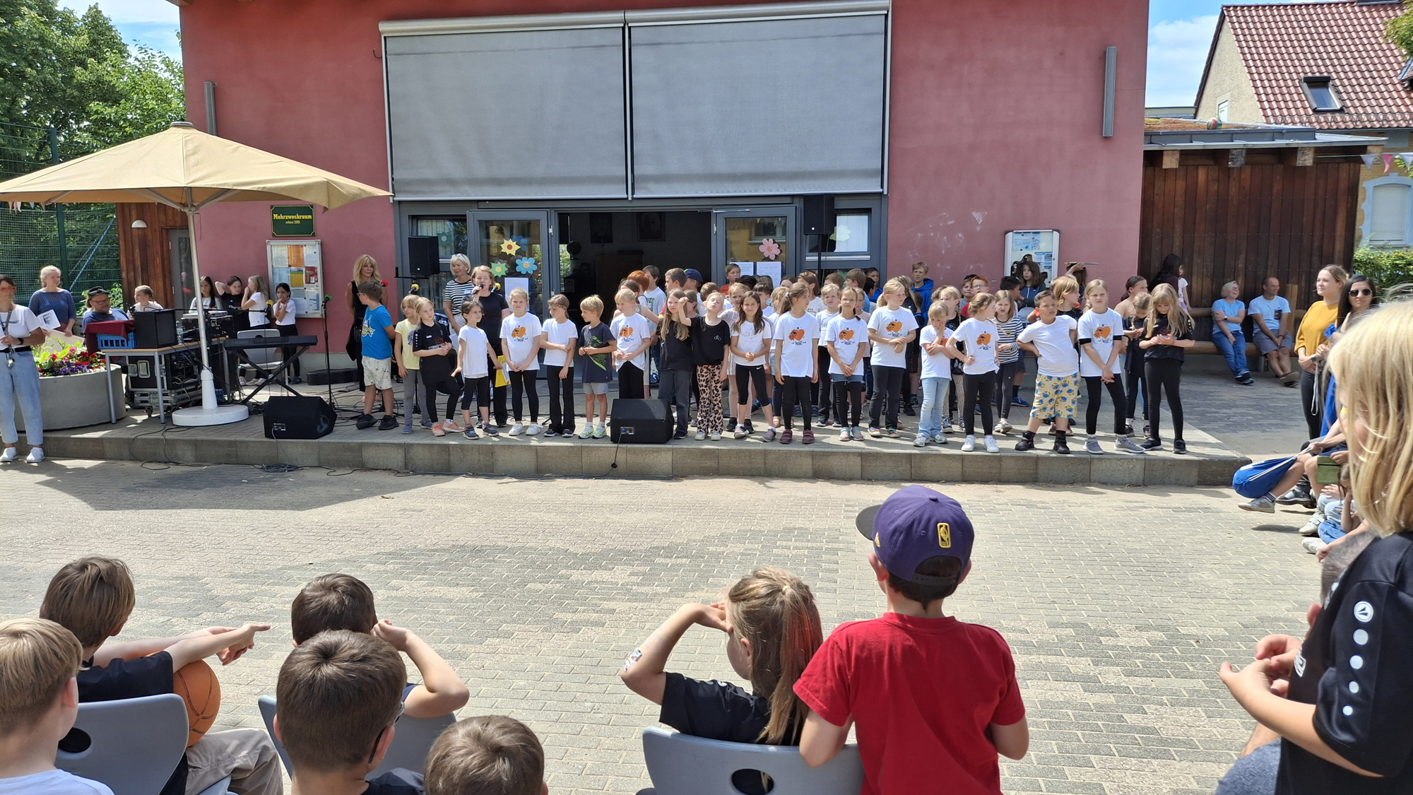Wenige Tage vor dem Start der Sommerferien gab es wieder ein Fest auf dem Schulhof der EInstein-Grundschule in Caputh. Und wieder war es ein wirklich wunderschöner Nachmittag! Das Wetter spielte toll mit – bis auf ein paar wenige Regentropfen blieb es super sonnig und herrlich warm. So konnten alle Show-Anteile auf der Bühne vor dem Mehrzweckraum stattfinden und viele Eltern, Freunde und Angehöreige nutzten diese Möglichkeit. Was die Kinder im vergangenen Schuljahr in den verschiedensten AGs auf die Beine gestellt und gelernt haben, wurde voller Freude präsentiert.
