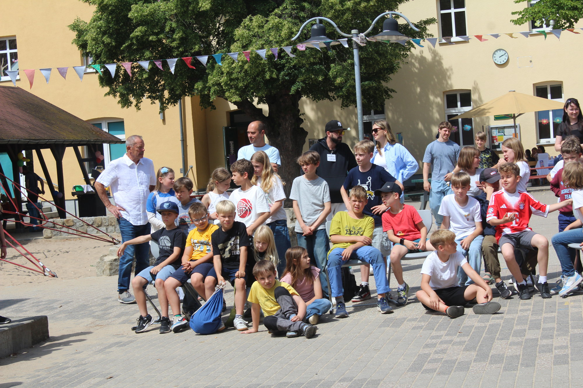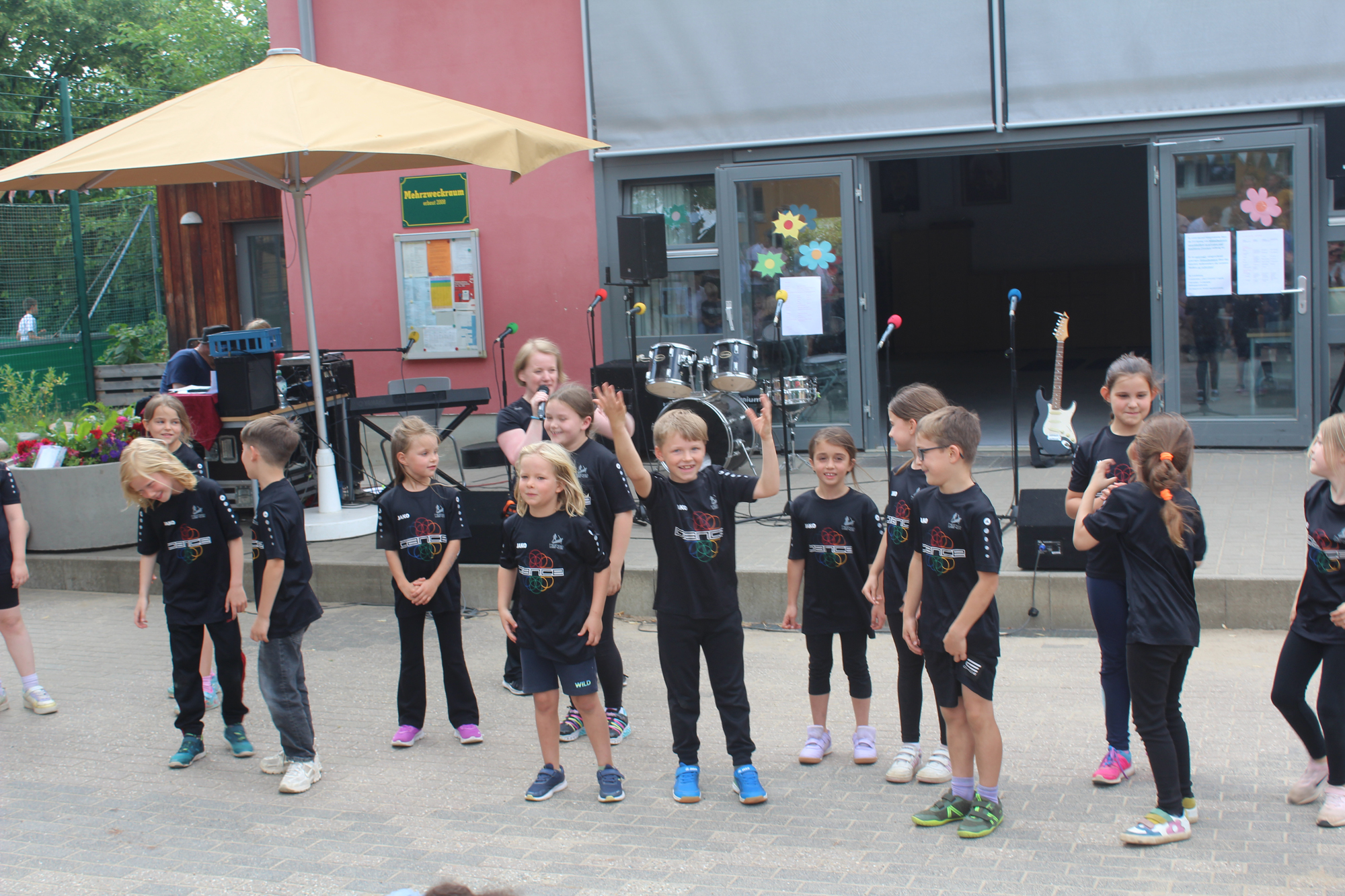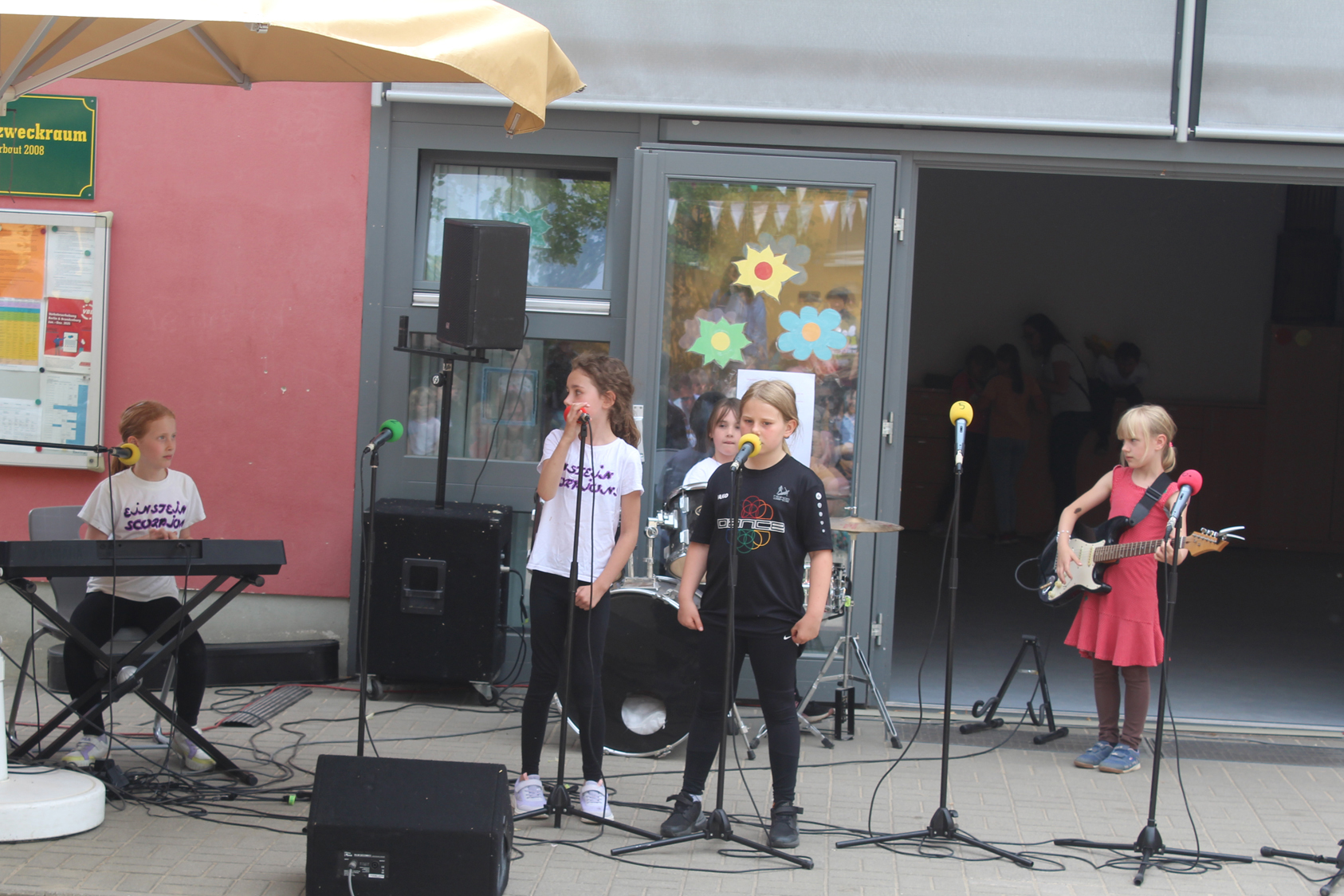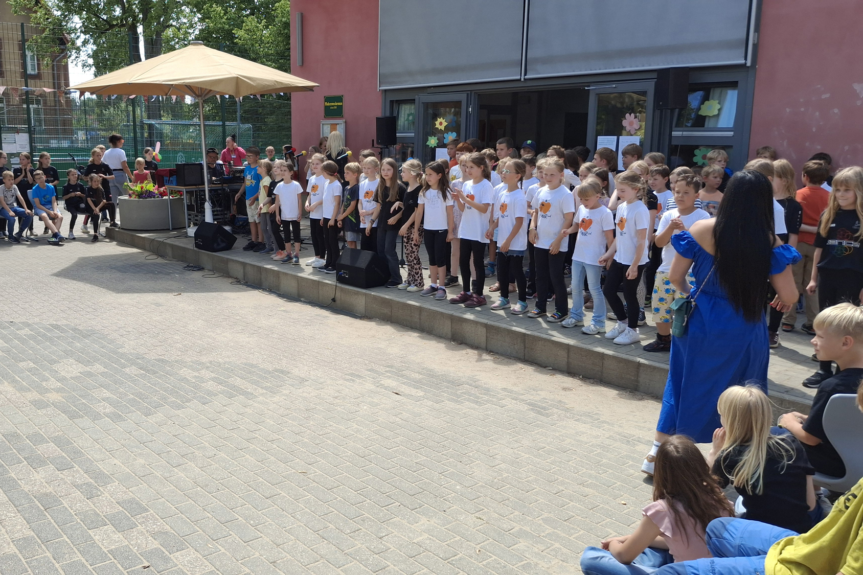 Wenige Tage vor dem Start der Sommerferien gab es wieder ein Fest auf dem Schulhof der EInstein-Grundschule in Caputh. Und wieder war es ein wirklich wunderschöner Nachmittag! Das Wetter spielte toll mit – bis auf ein paar wenige Regentropfen blieb es super sonnig und herrlich warm. So konnten alle Show-Anteile auf der Bühne vor dem Mehrzweckraum stattfinden und viele Eltern, Freunde und Angehöreige nutzten diese Möglichkeit. Was die Kinder im vergangenen Schuljahr in den verschiedensten AGs auf die Beine gestellt und gelernt haben, wurde voller Freude präsentiert.