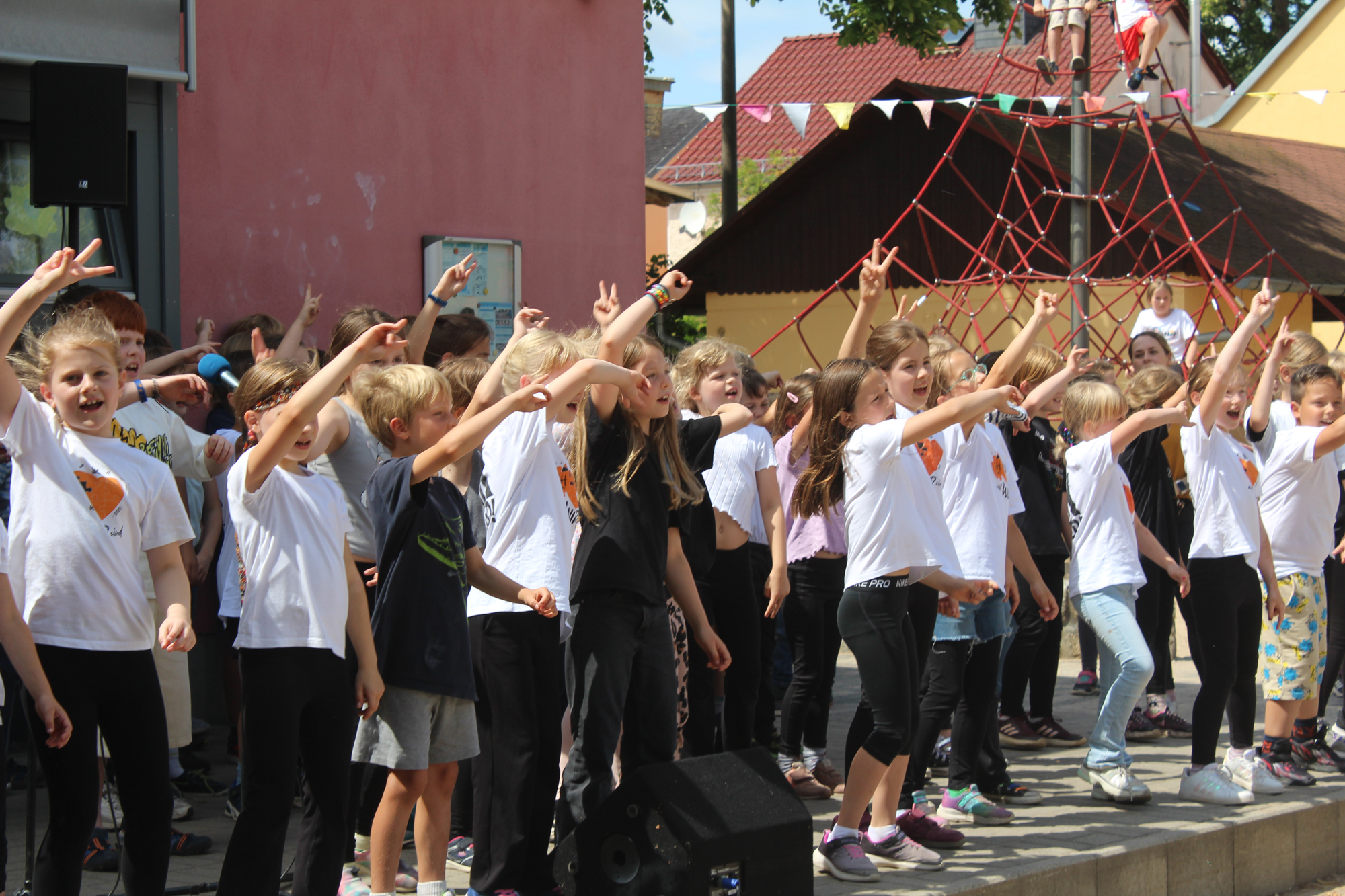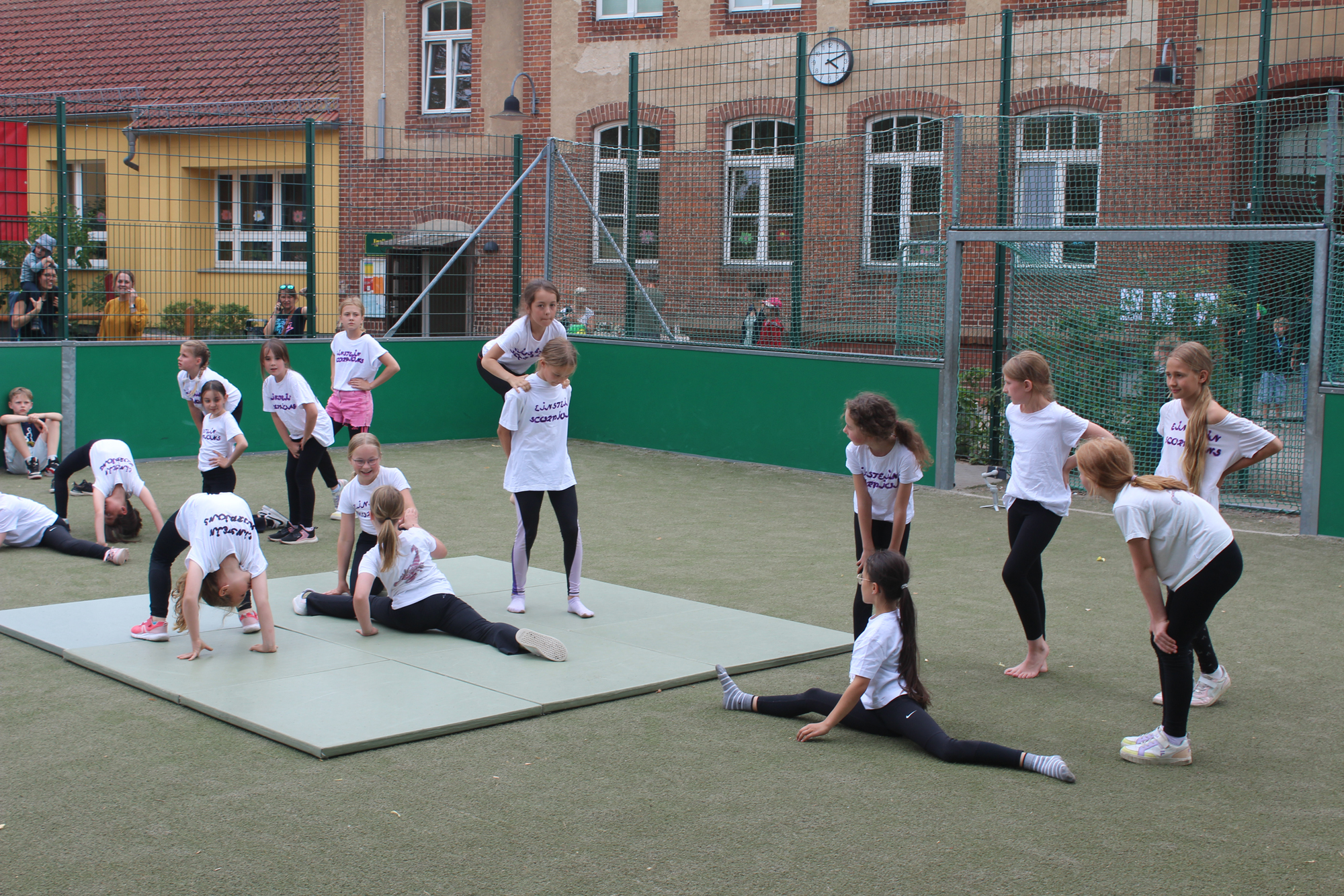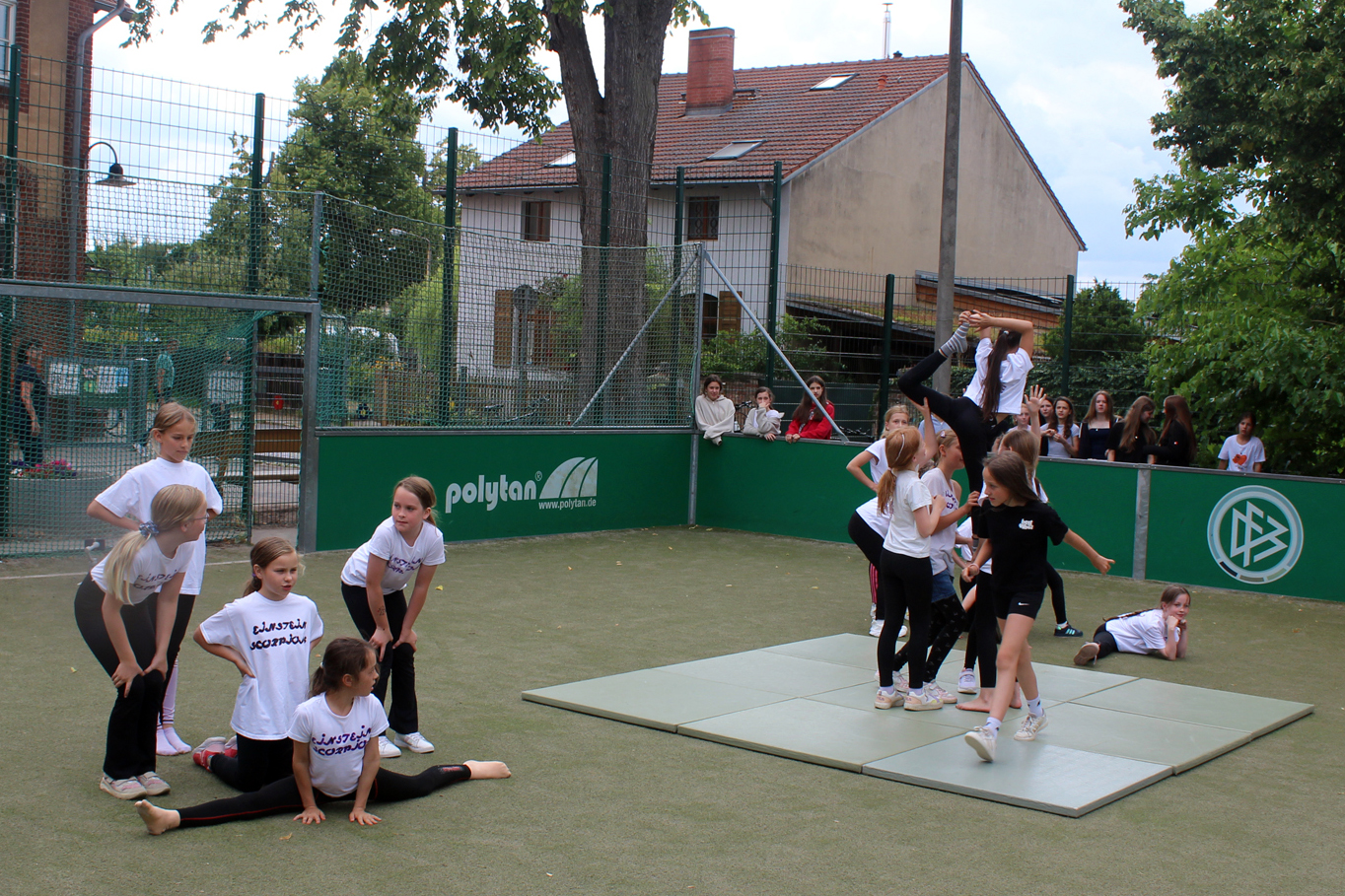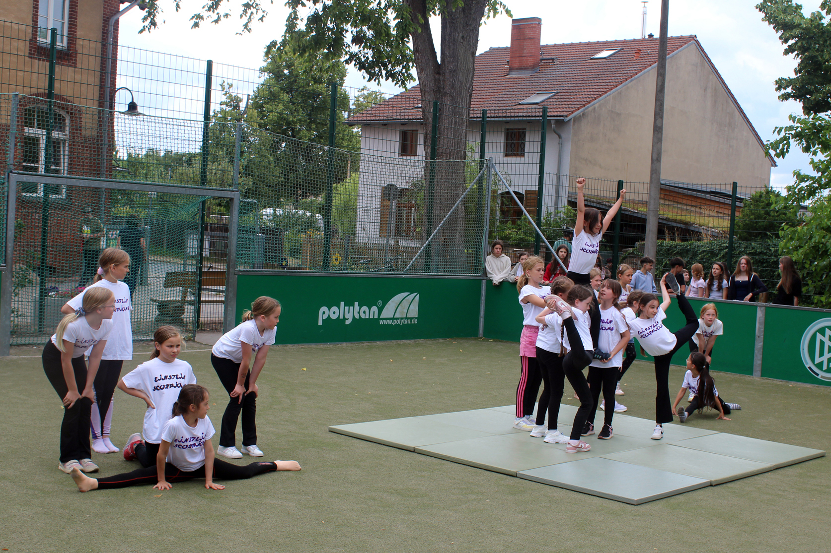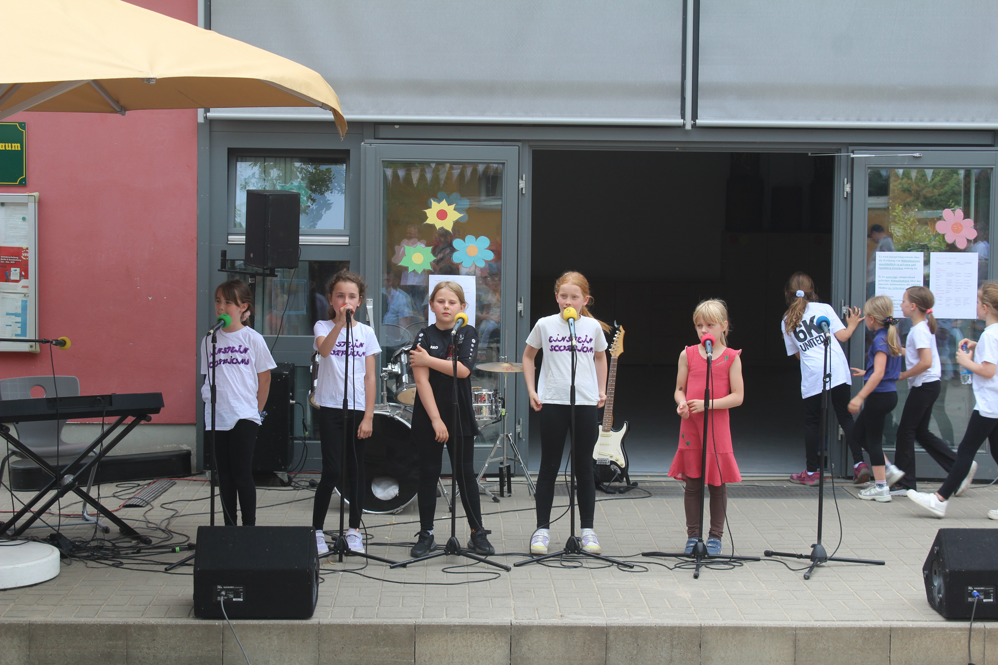 Wenige Tage vor dem Start der Sommerferien gab es wieder ein Fest auf dem Schulhof der EInstein-Grundschule in Caputh. Und wieder war es ein wirklich wunderschöner Nachmittag! Das Wetter spielte toll mit – bis auf ein paar wenige Regentropfen blieb es super sonnig und herrlich warm. So konnten alle Show-Anteile auf der Bühne vor dem Mehrzweckraum stattfinden und viele Eltern, Freunde und Angehöreige nutzten diese Möglichkeit. Was die Kinder im vergangenen Schuljahr in den verschiedensten AGs auf die Beine gestellt und gelernt haben, wurde voller Freude präsentiert.